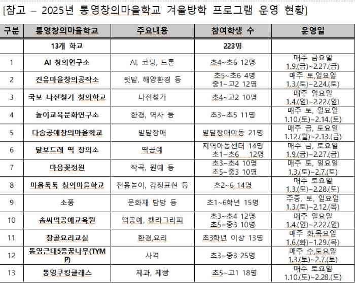 이번 겨울 방학 프로그램은 AI창의연구소, 통영쿠킹클래스, 국보 나전칠기학교 등 13개 통영창의마을학교에서 운영되며, 1월 초부터 순차적으로 개강해 2월 말까지 진행된다. 다양한 체험 중심 프로그램을 통해 학생들의 창의력과 자기 주도적 학습 역량을 키우는 동시에 방학 기간 돌봄 기능도 함께 수행할 것으로 기대된다.