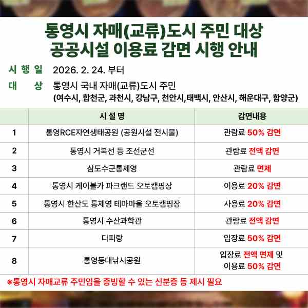 감면 대상 시설은 ▲디피랑 ▲삼도수군통제영 ▲거북선 등 조선 군선 ▲수산과학관 ▲케이블카파크랜드 오토캠핑장 ▲한산도 통제영 오토캠핑장 ▲통영RCE자연생태공원 ▲등대낚시공원 등 주요 공공시설 8개소이다. 자매 도시 또는 교류 도시 주민임을 확인할 수 있는 신분증을 제시하면 통영시민과 동일한 이용료로 시설을 이용하거나 관람할 수 있다.