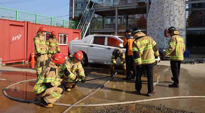 훈련 주요 내용은 ▲전기차 구조 및 배터리 특성 이해 ▲배터리 열폭주(thermal runaway) 대응 절차 숙달 ▲고전압 전기차 화재 시뮬레이션 및 진압 실습 ▲인명 구조 및 안전 확보 ▲유해 가스 누출 및 2차 폭발 위험 대응 매뉴얼에 따른 후속 조치 등이다.