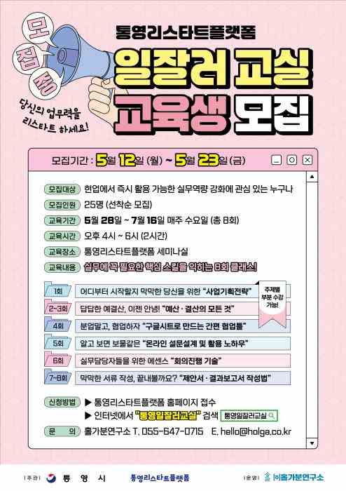 통영리스타트플랫폼, 취‧창업 프로그램 ‘일잘러 교실’교육생 모집