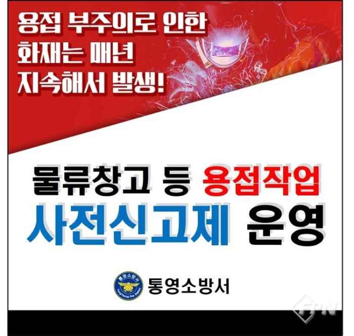 통영소방서(서장 박길상)는 3일 봄철 화재예방대책의 일환으로 ‘물류창고 등 용접작업 사전신고제’를 운영 중이라고 밝혔다.소방서에 따르면 물류창고는 다량의 가연물이 적재돼 화재에 취약하다. 특히 단…