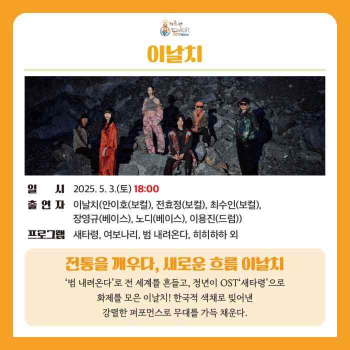 두 번째 공연은 ‘범 내려온다’로 전 세계를 흔들고, 정년이 OST ‘새타령’으로 화제를 모은 이날치 밴드의 공연으로 ‘범 내려온다’, ‘새타령’, ‘여보나리’, ‘히히하하’등 다양한 곡들이 약 65분간 한국적 색채로 빚어낸 강렬한 퍼포먼스로 강구안 해상무대를 가득 채울 예정이다.