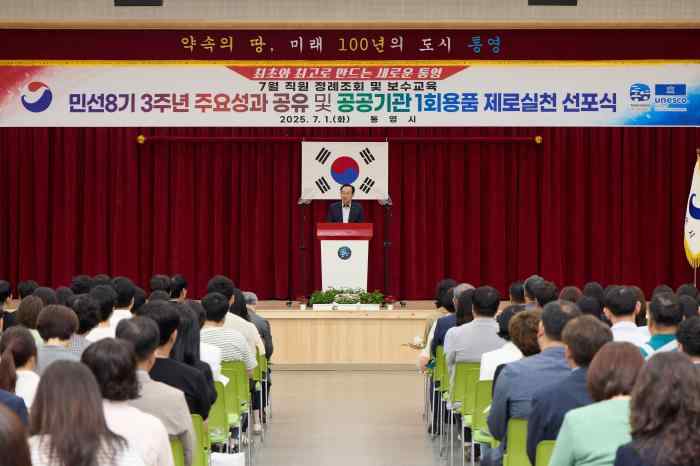 통영시(시장 천영기)는 7월 1일 시청 강당에서 직원 250여 명이 참석한 가운데 민선 8기 4년 차를 시작하는 첫 정례조회를 열고, 지난 3년간의 주요 시정 성과를 되돌아보는 시간을 가졌다.