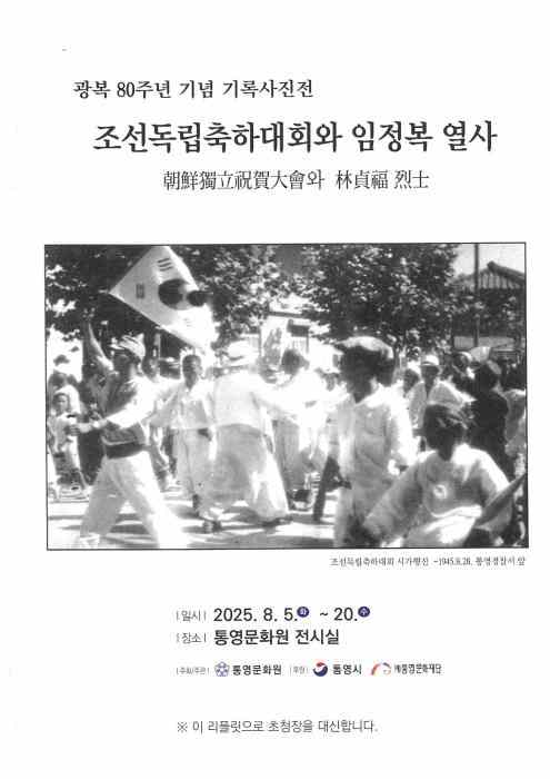 통영문화원(원장 김일룡)은 광복 80주년을 맞아 오는 8월 5일(화)부터 20일(수)까지 통영문화원 전시실에서 ‘조선독립축하대회와 임정복 열사’ 사진전을 개최한다.