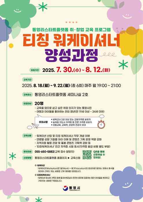 ‘티칭 워케이셔너(Teaching Workationer)’는 일(work)과 휴가(vacation)를 병행하는 워케이션 환경에서 부모가 업무에 집중할 수 있도록 아이들을 돌보고 교육하는 새로운 직업 모델이다. 이번 교육은 특히 여행과 교육을 업으로 삼고 싶은 통영시민과 관외 청년을 대상으로 한다.